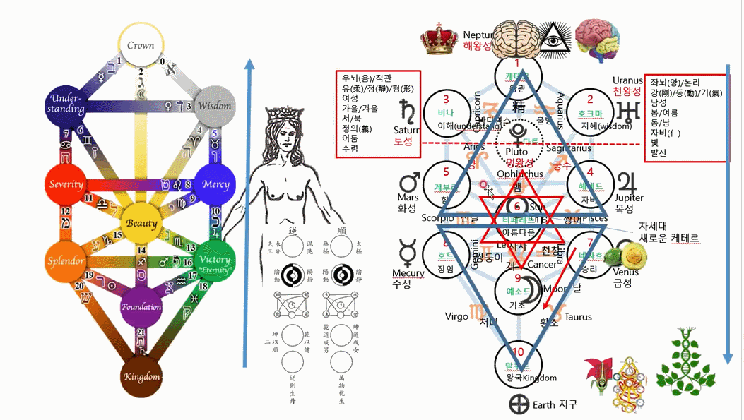 음양 회전 운동을 통해서 5원소가 생성이 되며 5원소까지가 케테르(Keter→왕관)라고 합니다. 5원소가 생성이 되서 진행이 되면 건도성남과 곤도성녀로부터 만물이 화생하는 것이라고 합니다. 건도성남은 호크마(Hochma→지혜)와 동등하며 그리고 곤도성녀는 비나(Binah→이해)를 의미합니다. |