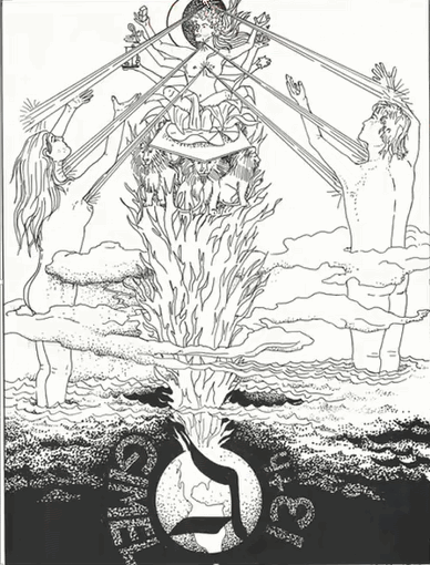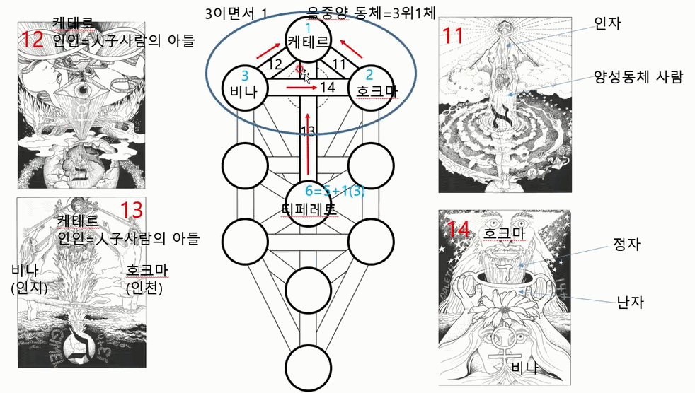 이제 티페레트 자궁에서(6은 5+1이다) 13번 경로를 타고 역방향으로 즉 케테르(Keter) 쪽으로 올라갑니다. 13번 경로를 보시면 여성은 비나(Binah) 그리고 남성은 호크마(Hochma)를 나타낸 것입니다. 또한 여섯 팔 및 해와 달을 보실 수 있습니다. 이는 태양과 달이 합해진다는 것보다는 옛 달이 죽고 새로운 달이 나오는 것을 의미한다고 합니다. 호크마(Hochma)는 인천-사람 속에 하늘, 비나(Binah)는 인지 즉 사람 속에 땅 그리고 케테르(Keter)는 인인 즉 사람 속에 사람을 표현해 놓은 것이라고 합니다. 사람 속에도 하늘이 있고, 사람 속에도 땅이 있는데, 사람 속에 하늘과 땅이 만나서, 사람 속에 사람을 만들어 내니, 그것이 곳 사람의 아들이다. 그러니까 내 몸에서 그리스도 또는 에흐예 아쉐르 에흐예(I will be what I will be)의 몸이 나온다라는 말입니다. 이렇게 케테르(Keter)에서 태아의 모습으로 생성돼 나오는 것을 12번 경로에 그려놓았습니다. 11번 경로는 양성동체에서 에너지가 나가는 것을 그려놓은 것입니다. 11번 경로는 양성동체에서 에너지가 나가며 신과 하나가 되는 것을 그려놓은 것입니다. 14번 경로는 비나(Binah)가 호크마(Hochma)의 정액을 수용을 해서 난자에 받아들여 수정란을 만드는 과정을 표현한 것이라고 합니다. 성배는 자궁을 의미하며 호크마(Hochma)의 정액을 받아 금성을 만드는 것을 묘사한 것이라고 합니다. 호크마(Hochma)와 비나(Binah)의 결합을 통해서 케테르(Keter)를 만든다는 것입니다. 즉 양성동체이자 삼위일체를 의미합니다. 케테르는 하나 안의 셋 즉 삼위일체를 의미합니다. |