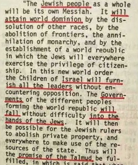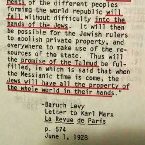 코로나 19 가짜 전염병의 진정한 이유는 바루흐 레비(Baruch Levy)가 칼 마르크스(Karl Marx)에게 보낸 편지를 보면 알 수 있습니다. "유대인 전체가 그들 자신의 메시야가 될 것입니다. 이는 다른 인종의 소멸, 국경의 철폐, 군주제(君主制)의 소멸, 그리고 세계 공화국의 설립을 통해 세계 지배권을 얻을 것이며 유대인들이 어디에서나 시민권의 특권을 행사할 것입니다. 이 신세계 질서에서는 이스라엘 자손들은 반대 세력과 부딪히지 않고 수령들이 될 것입니다. 세계 공화국을 구성하는 다른 민족의 정부는 어려움 없이 유대인들의 손에 넘어갈 것입니다. 그러면 유대 통치자들이 사유재산을 폐지시킬 수 있으며 어디에서나 국가 자원을 이용하는 것이 가능해질 것입니다. 그리하여 메시야의 때가 오면 유대인들이 온 세상의 모든 재산을 손에 쥐게 될 것이라는 탈무드의 약속이 성취될 것입니다." 바루흐 레비(Baruch Levy)가 칼 마르크스(Karl Marx)에게 보낸 편지, '라뷰 드 파리(La Revue de Paris)', 574페이지, 1928년 6월 1일 |
